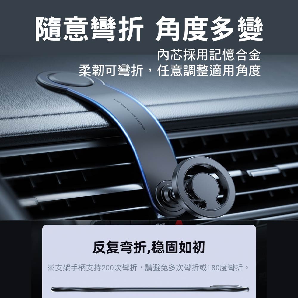 ・車用摺疊式磁吸支架,採用記憶合金內芯,可隨意彎折、調整角度,靈活安裝不受限