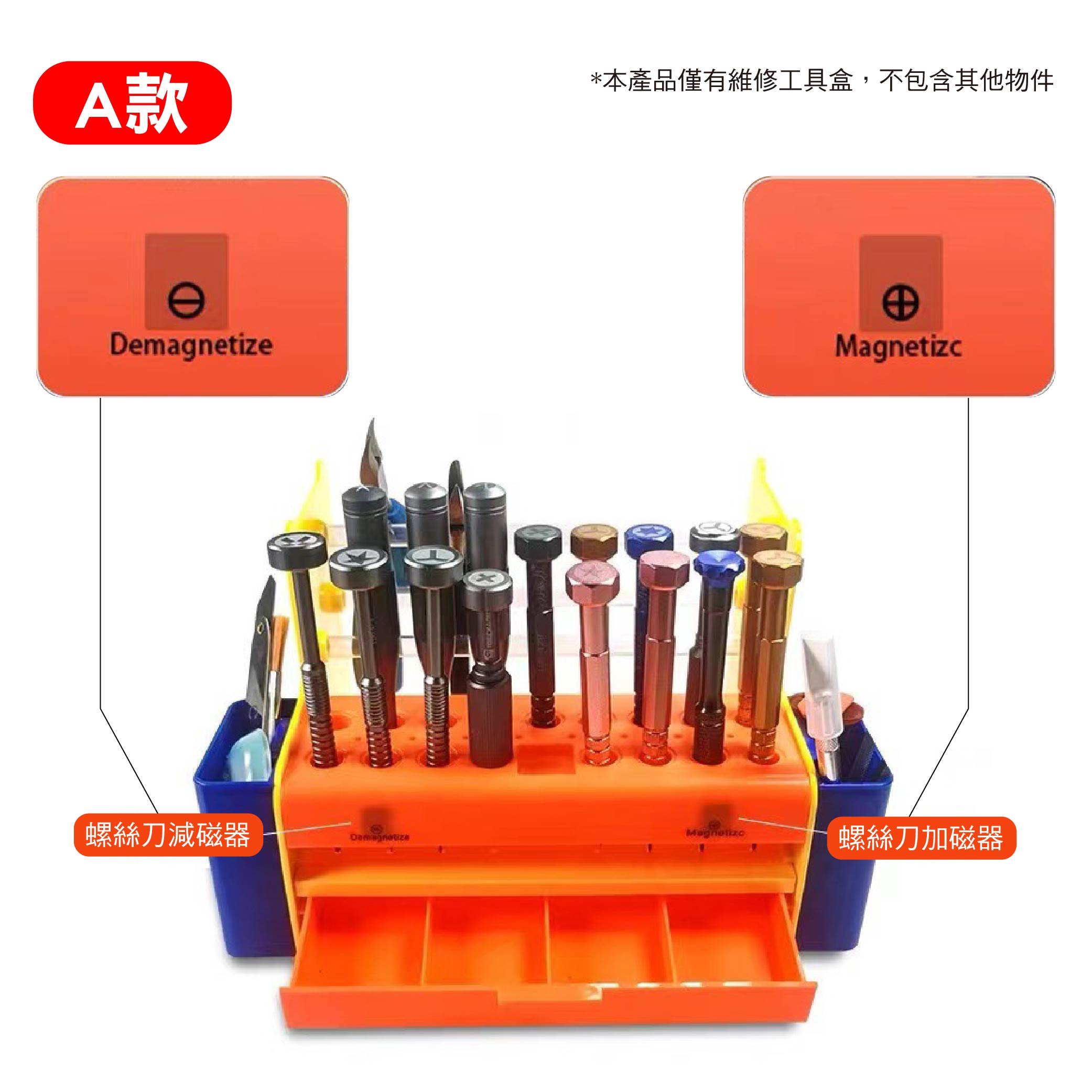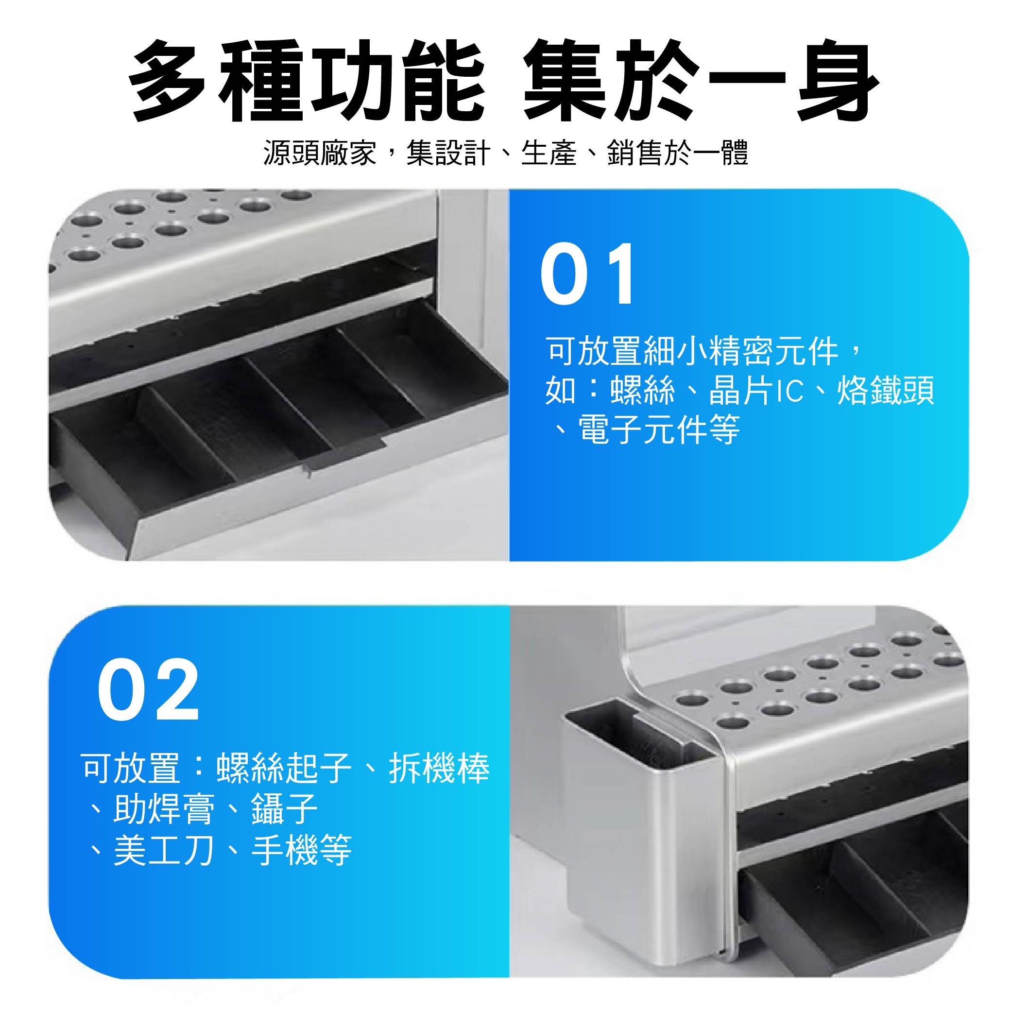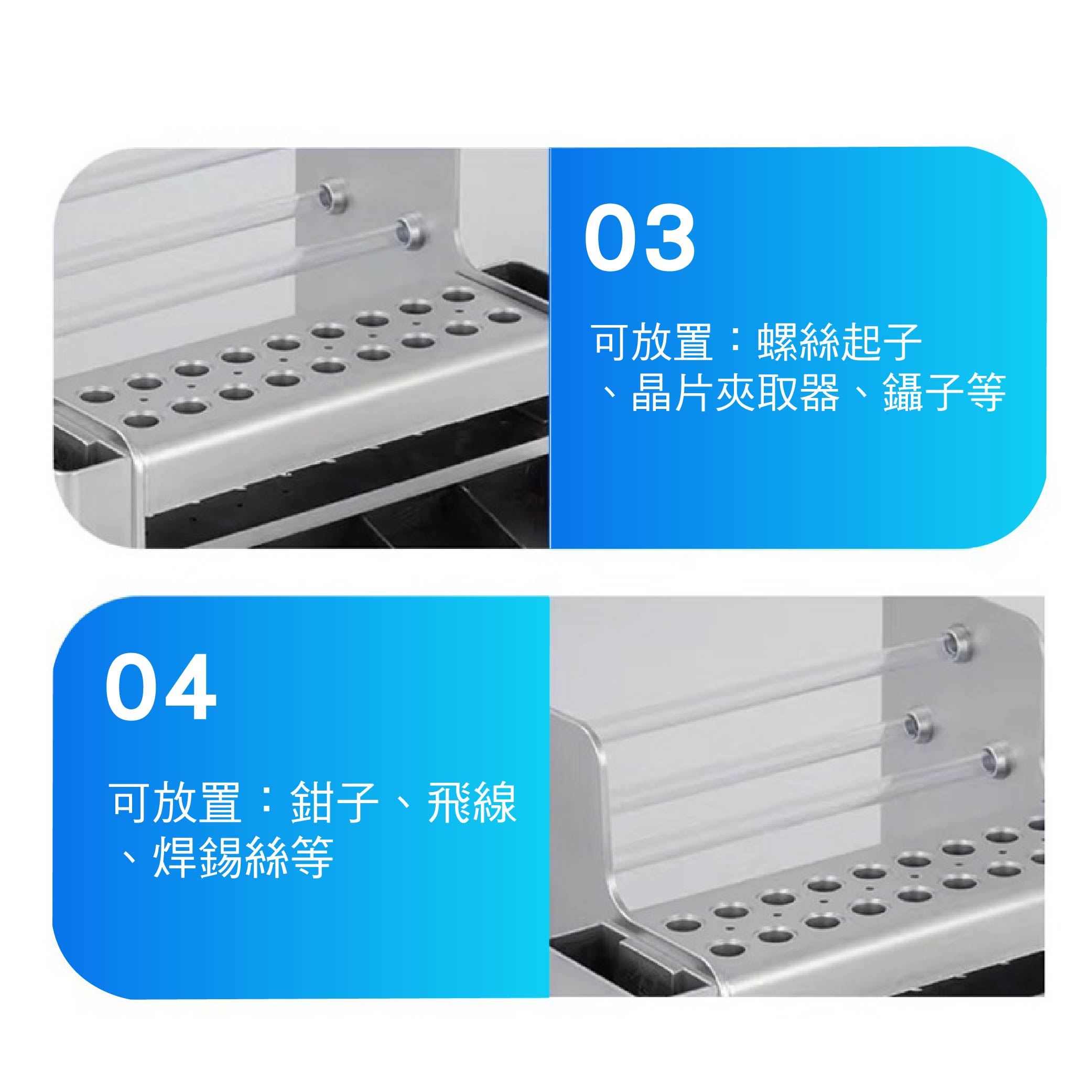 ◆ 上方多孔設計,可收納螺絲起子、拆機棒、美工刀、鑷子、焊錫絲、助焊膏等常用維修工具