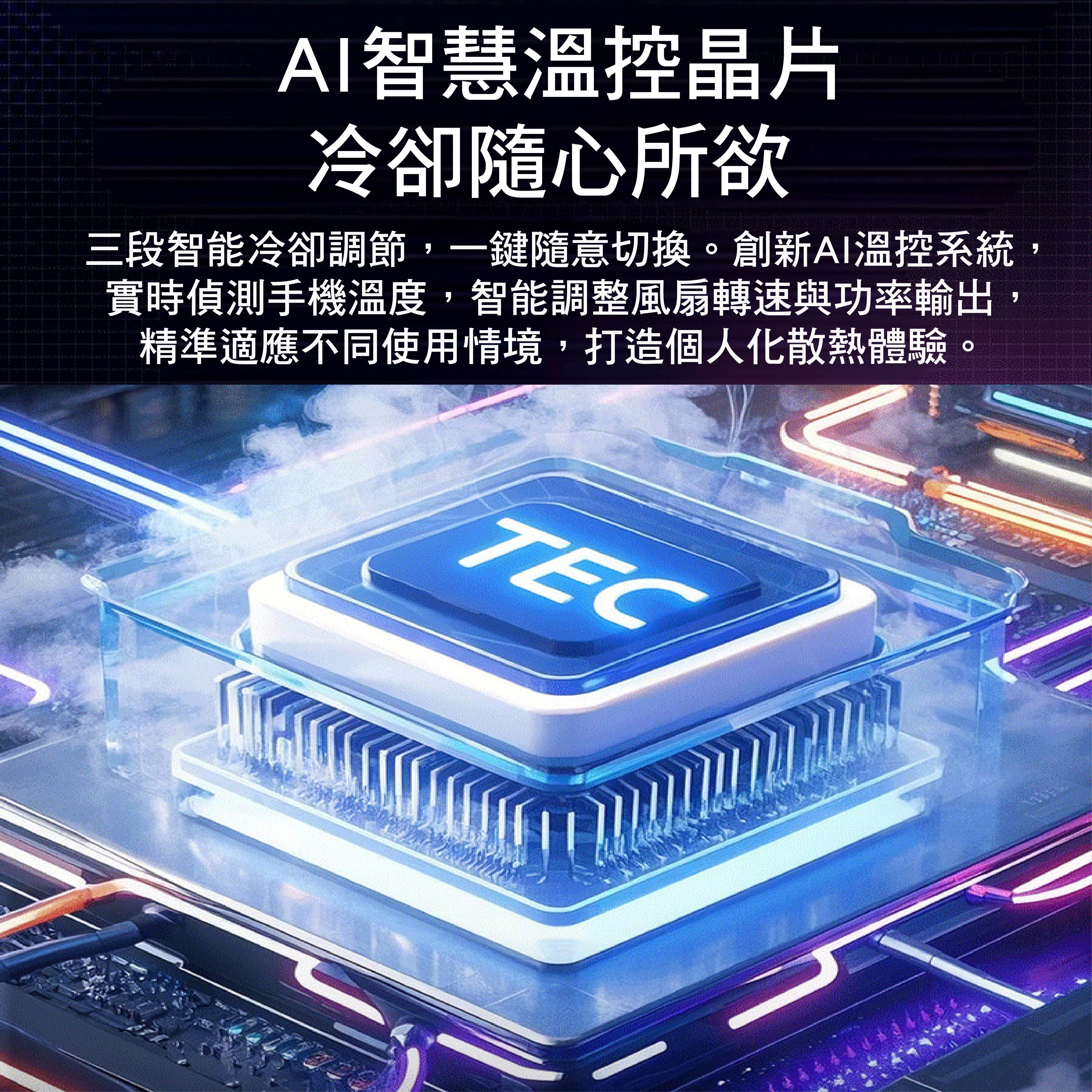 ◆ 搭載AI智慧溫控晶片,偵測手機溫度,自動調節風速與功率