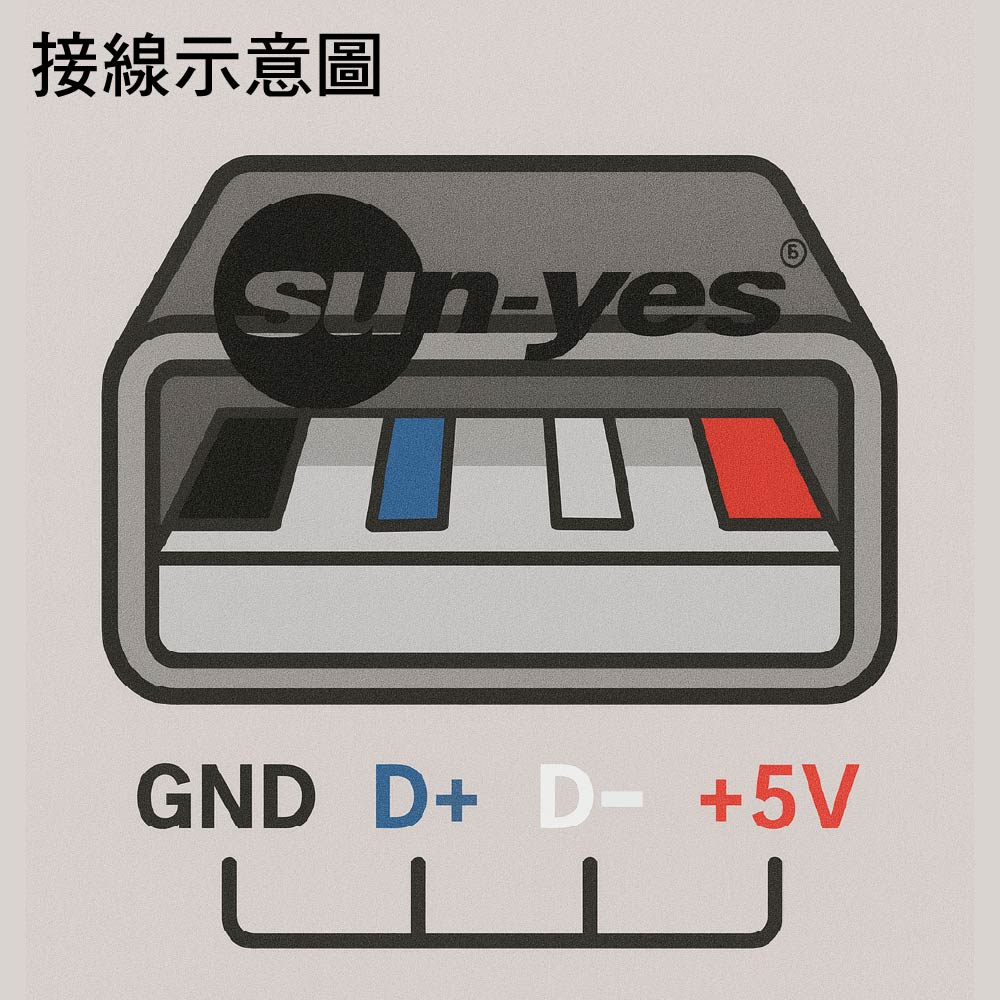 接線示意:USB接口 接點為 (黑線GND) (藍線D+) (白線D-) (紅+5V)