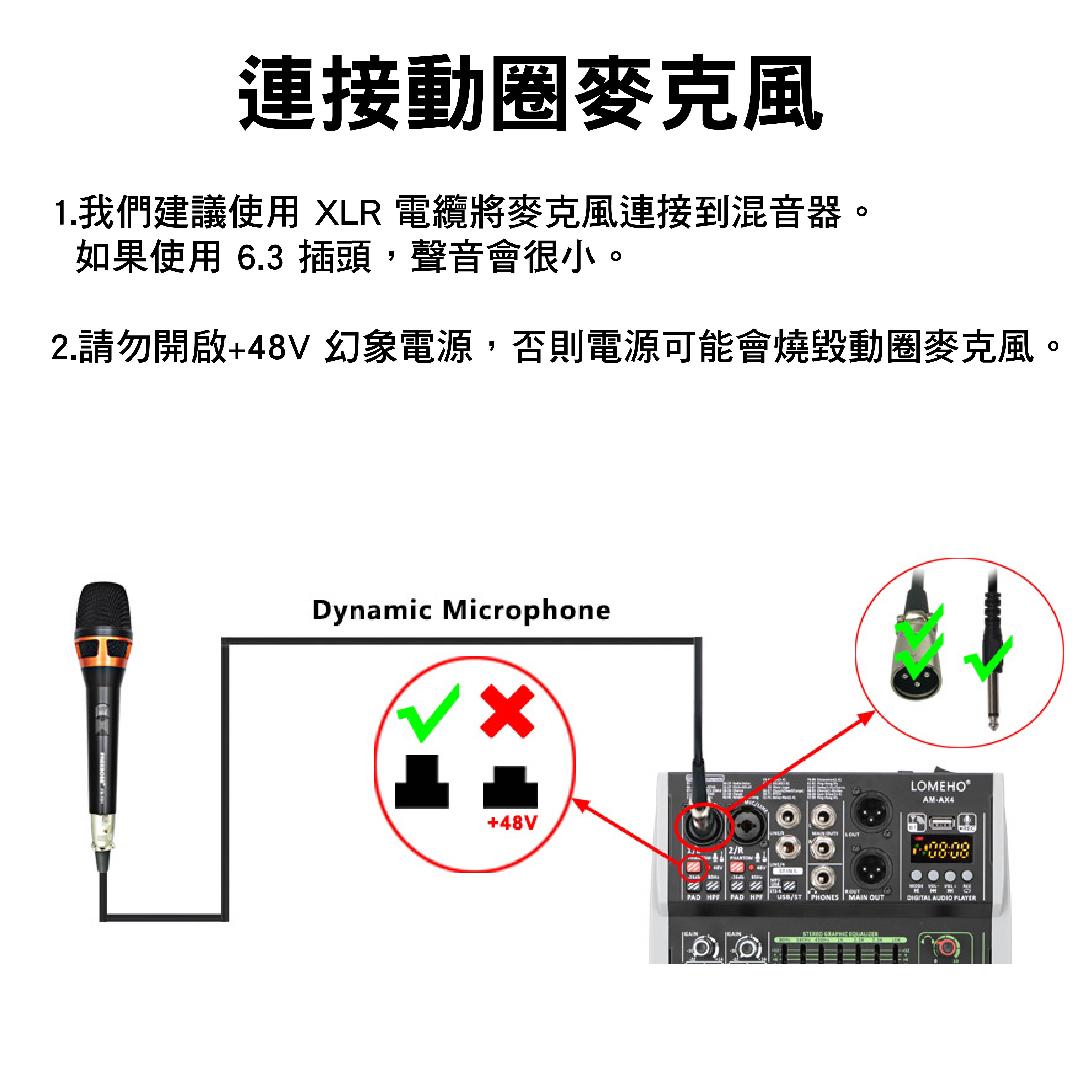 4.動圈麥克風建議使用XLR接口,請勿開啟幻象電源。