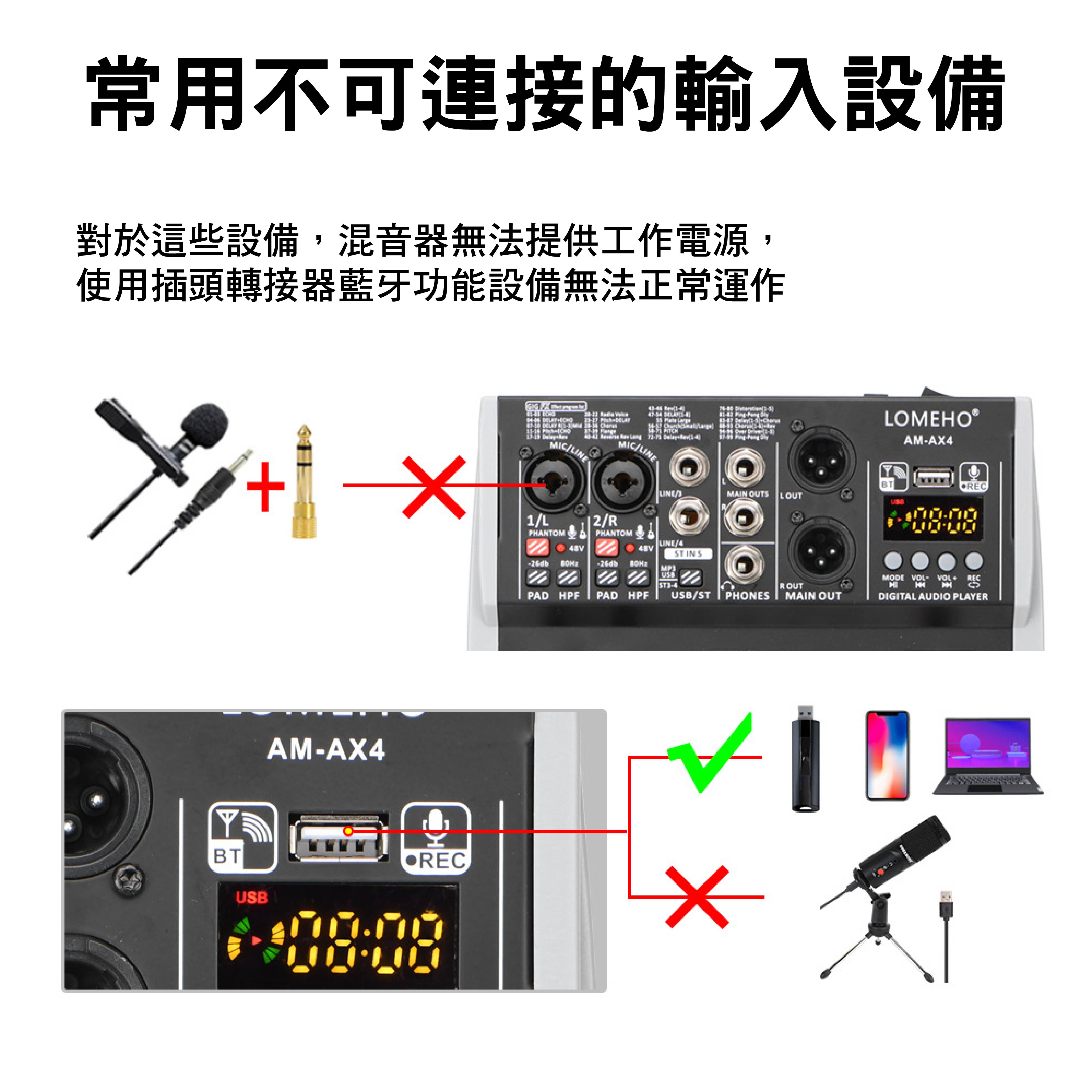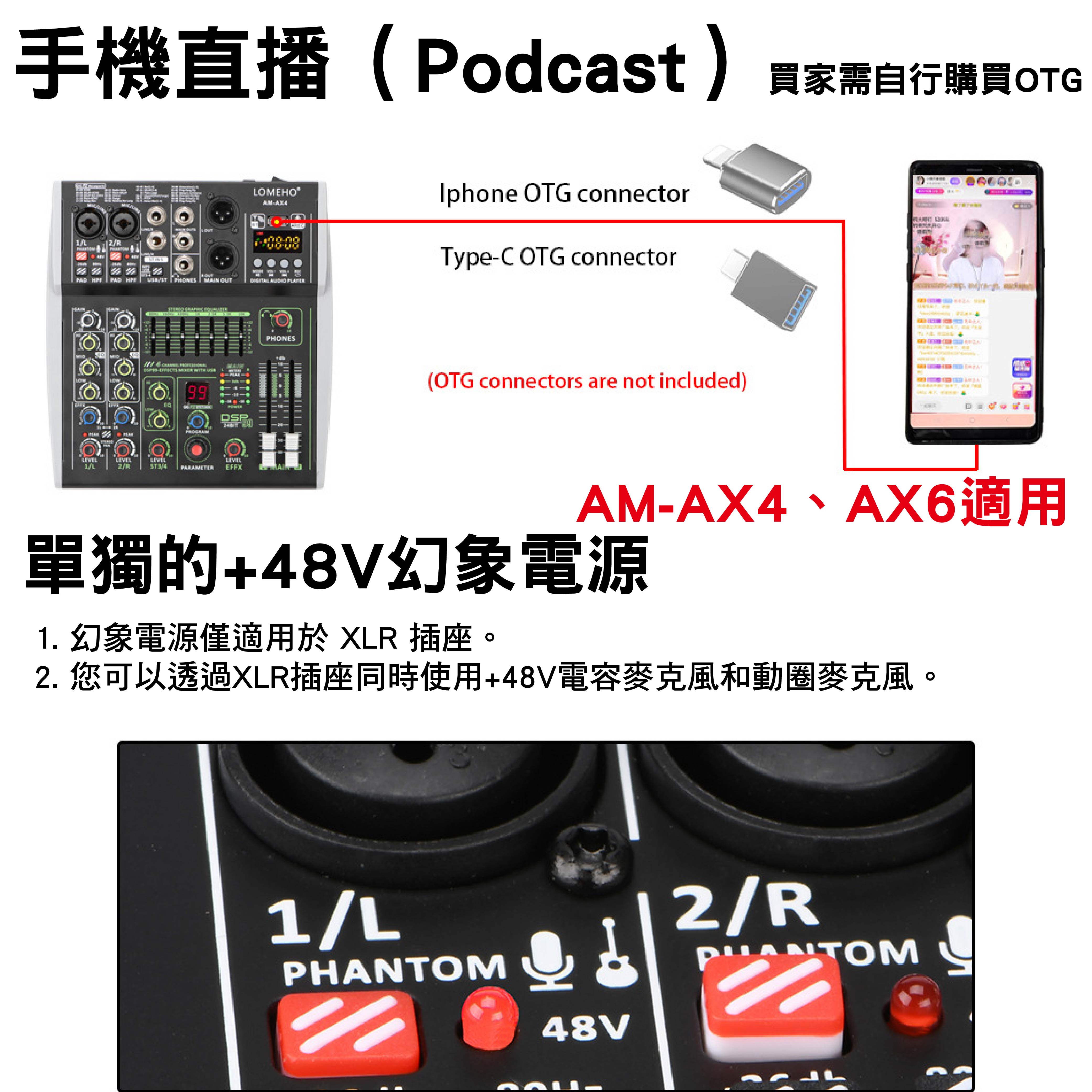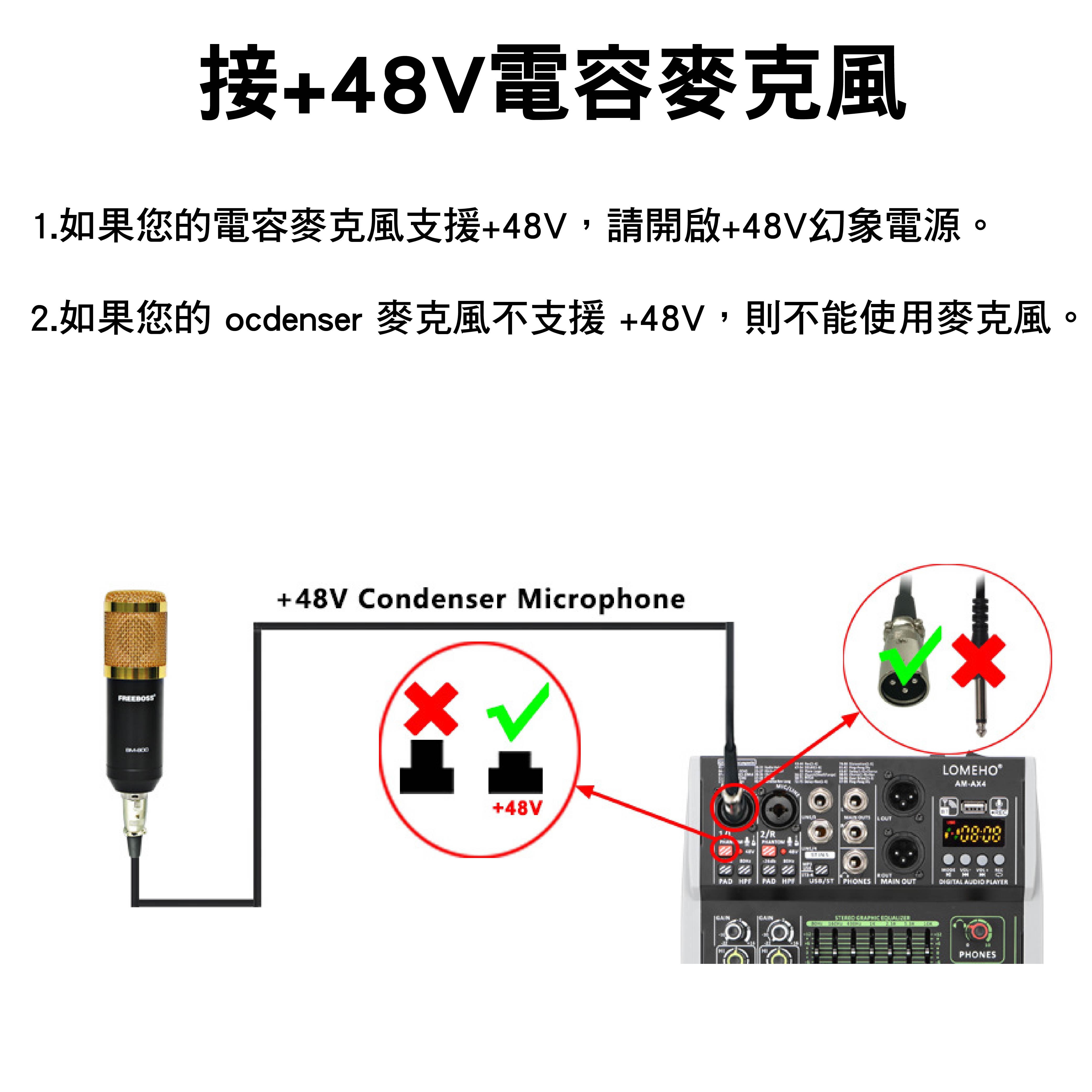 5.電容式麥克風若支援+48V,需開啟幻象電源;若不支援,請勿使用幻象電源。