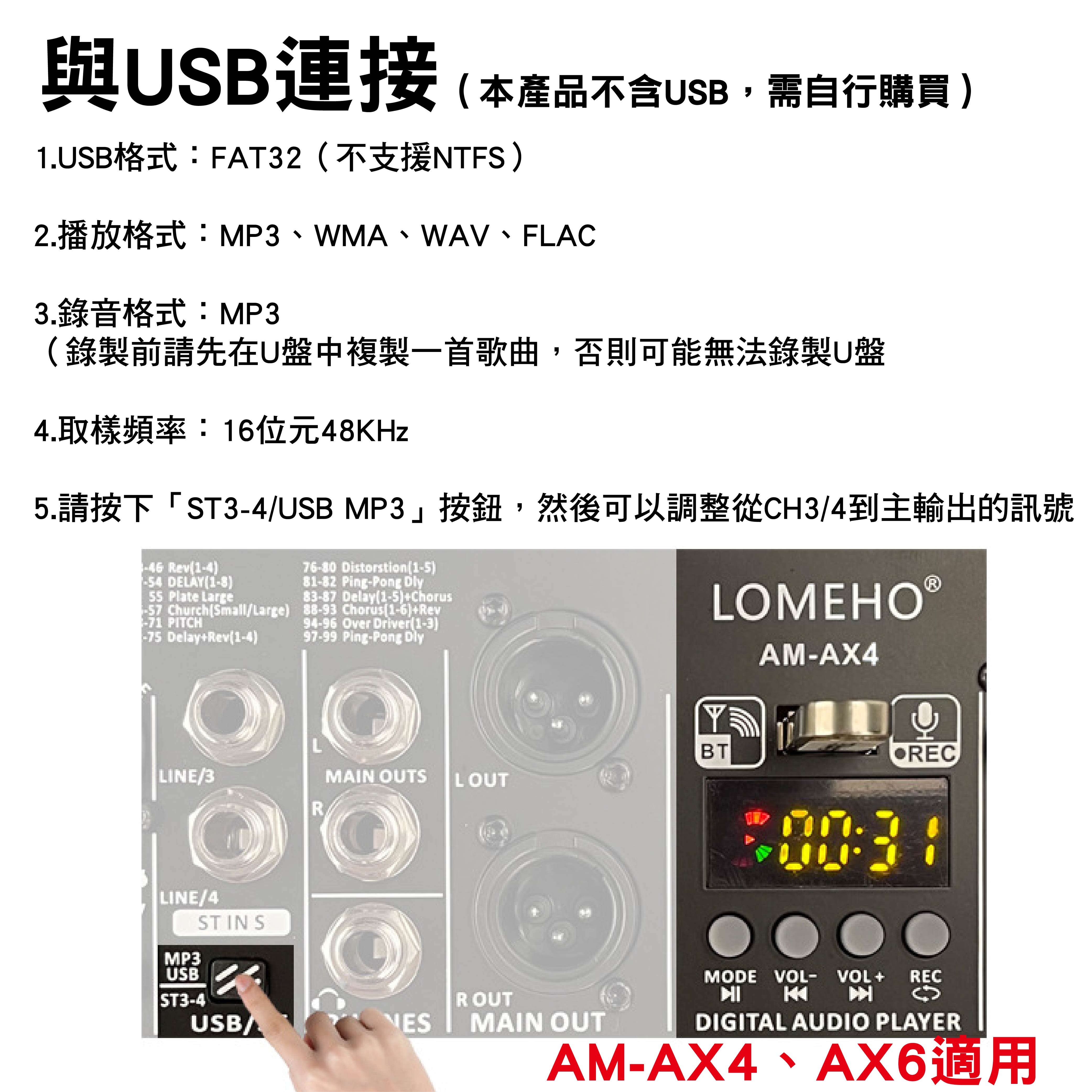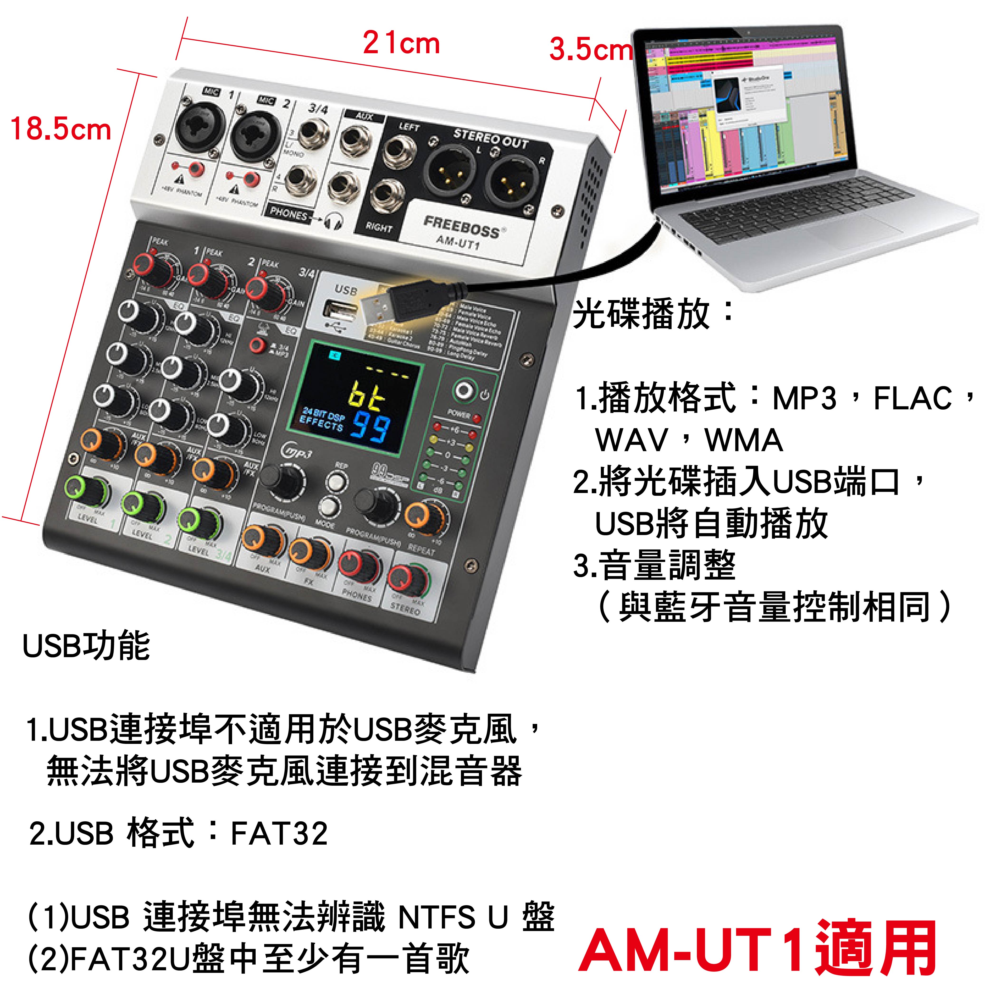 2.USB播放請使用格式為FAT32的U盤,錄音檔案為MP3格式,請先在U盤建立至少一首歌曲。
