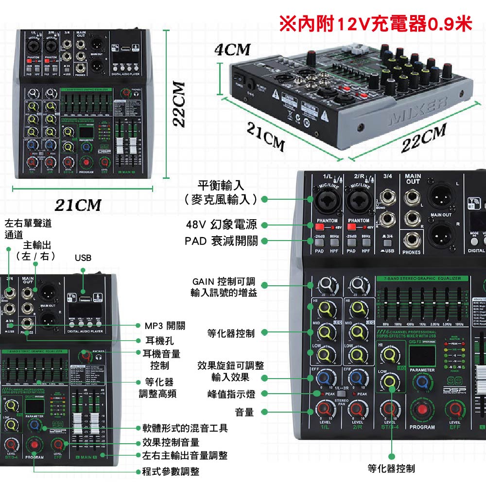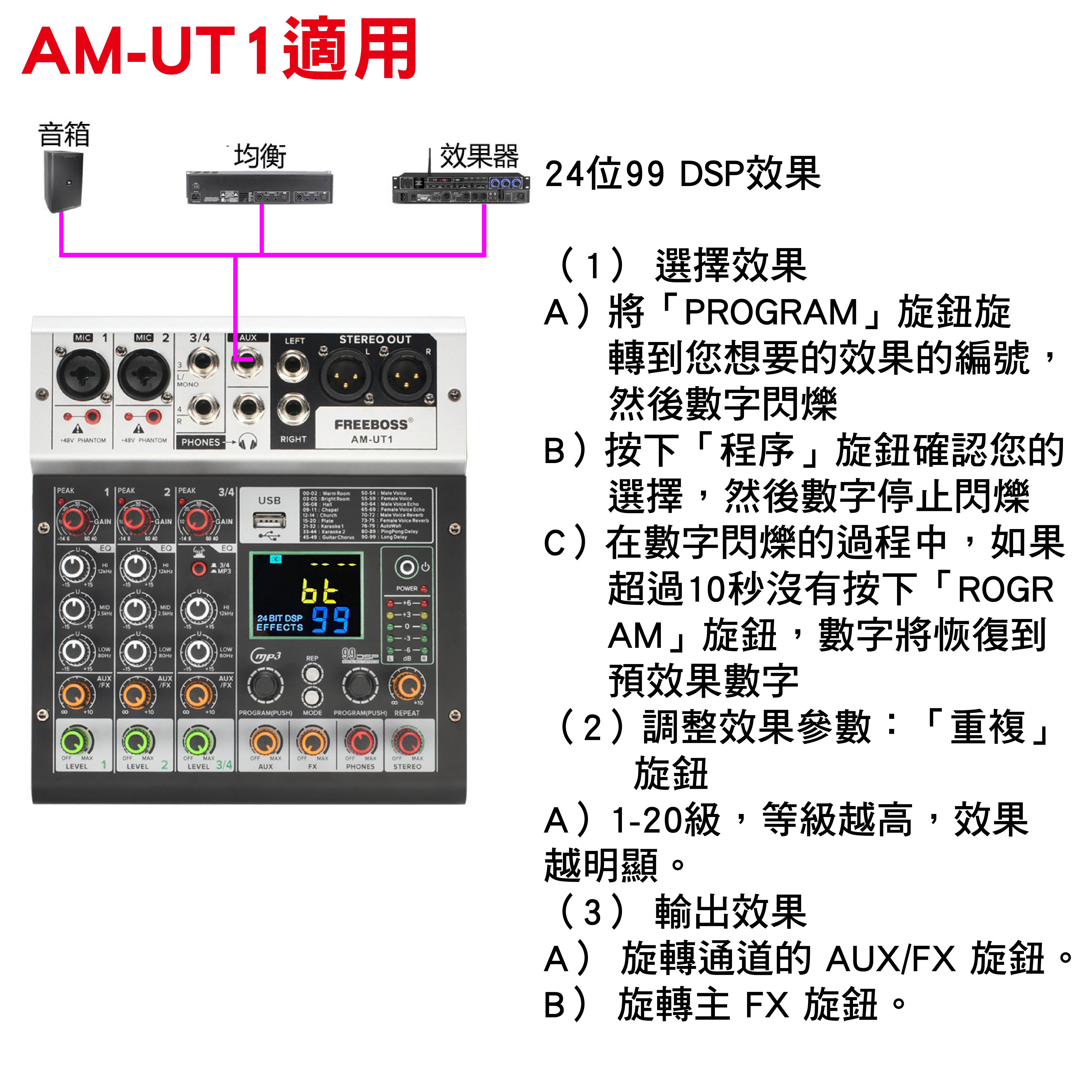 99種DSP音效模式(包括房間混響、教堂效果、K歌模式、男女聲、回音、延遲等)