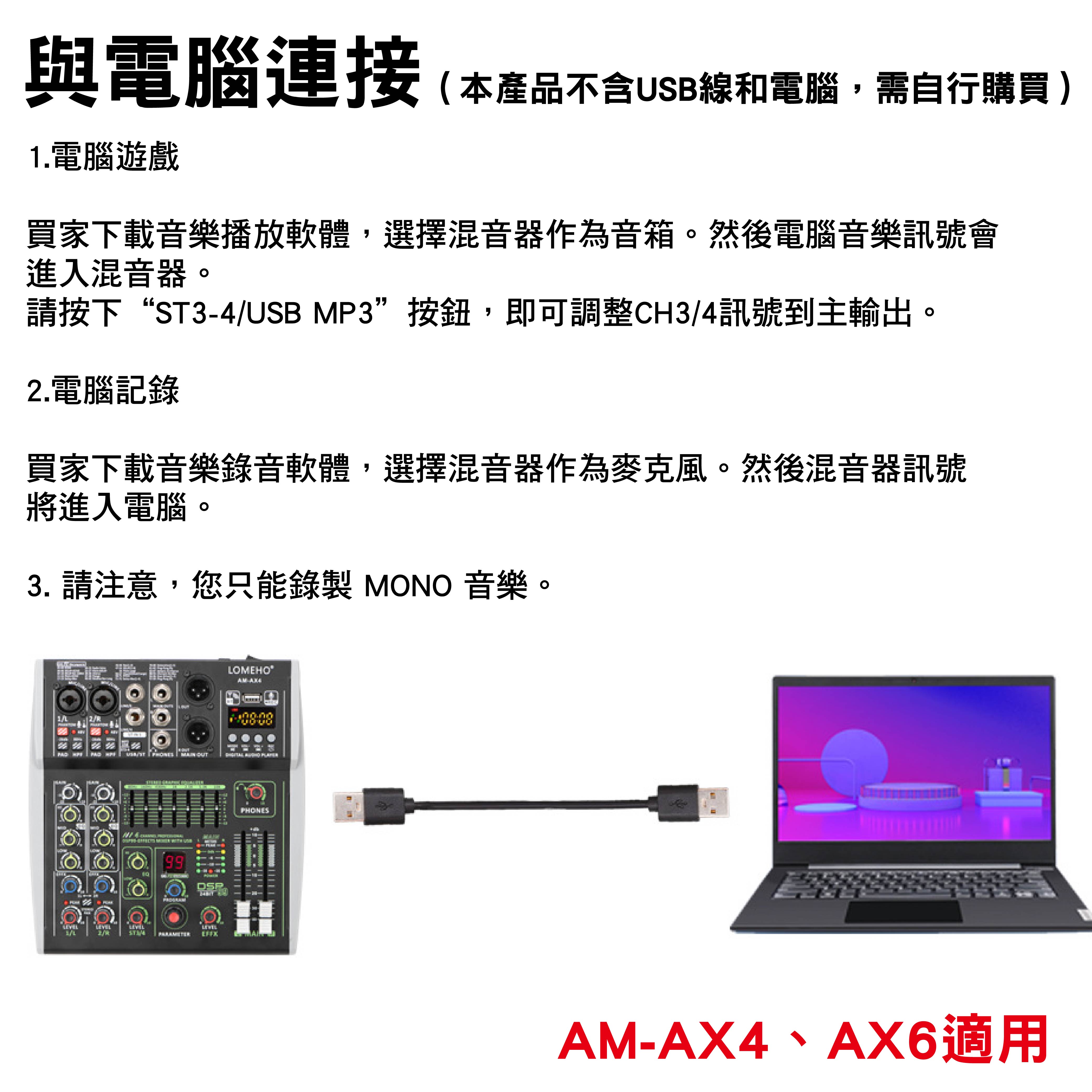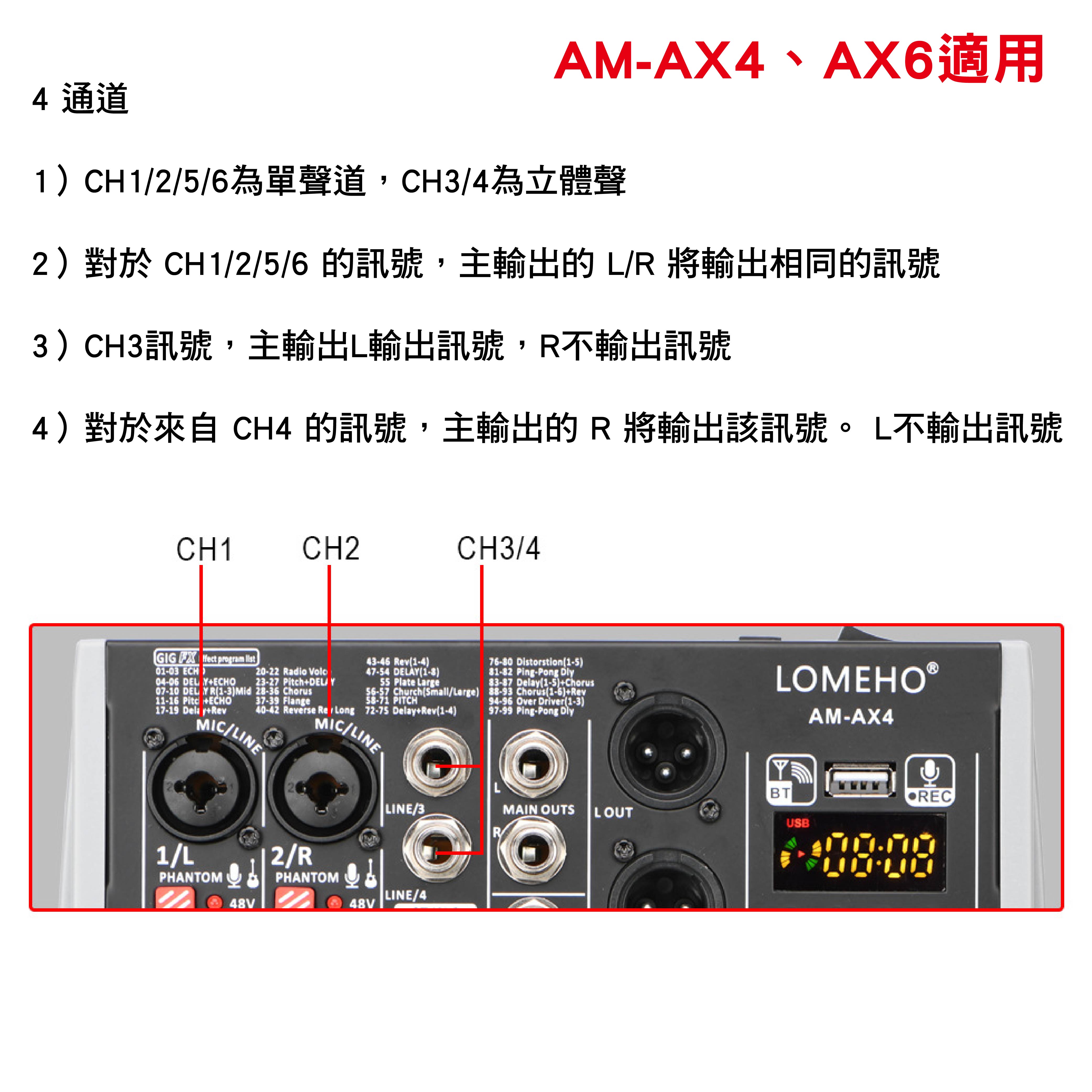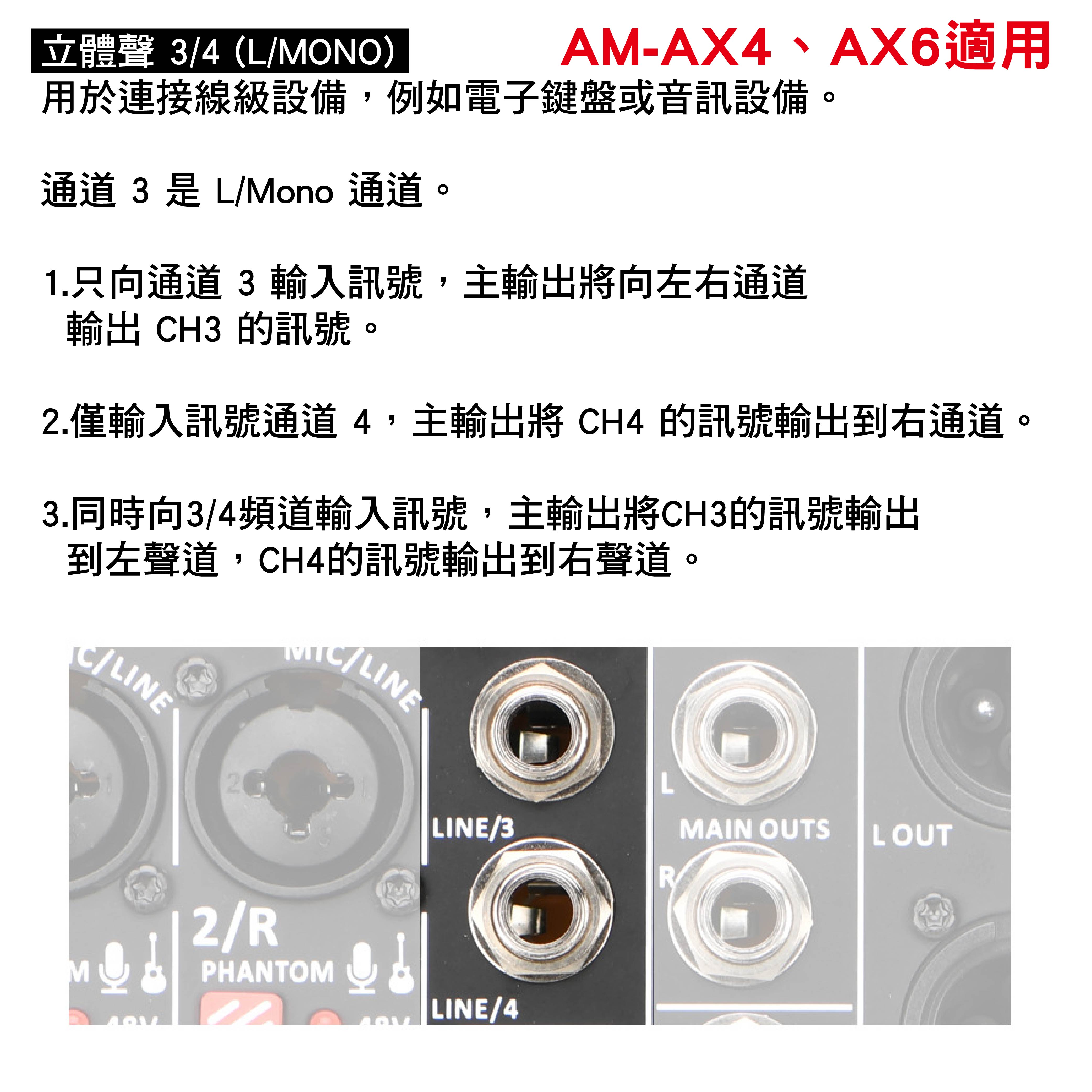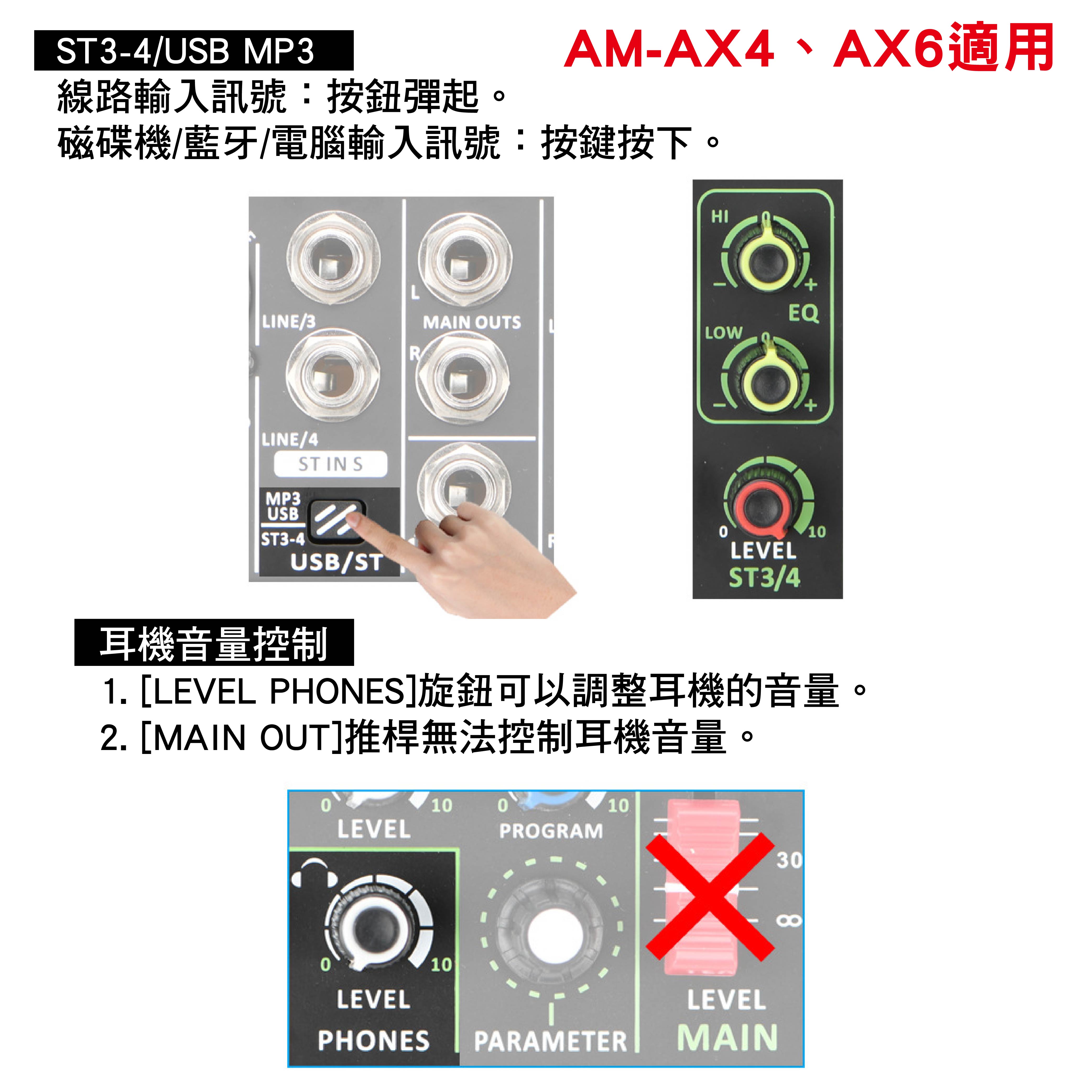 1.藍牙配對完成後,按下「ST3-4/USB MP3」鍵,聲音從CH3/4輸出至主輸出。