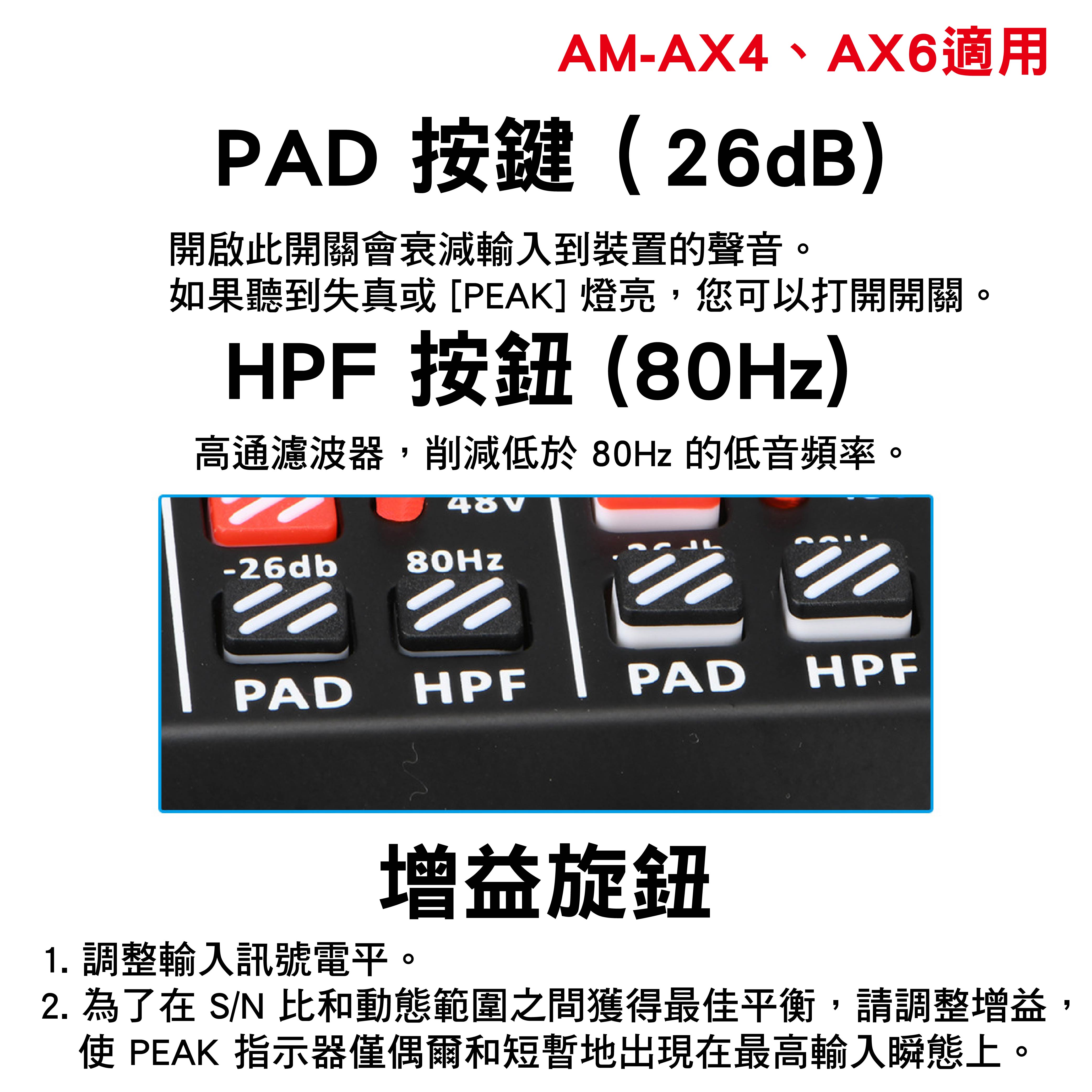 ◆ -26dB PAD減音功能,避免爆音失真
