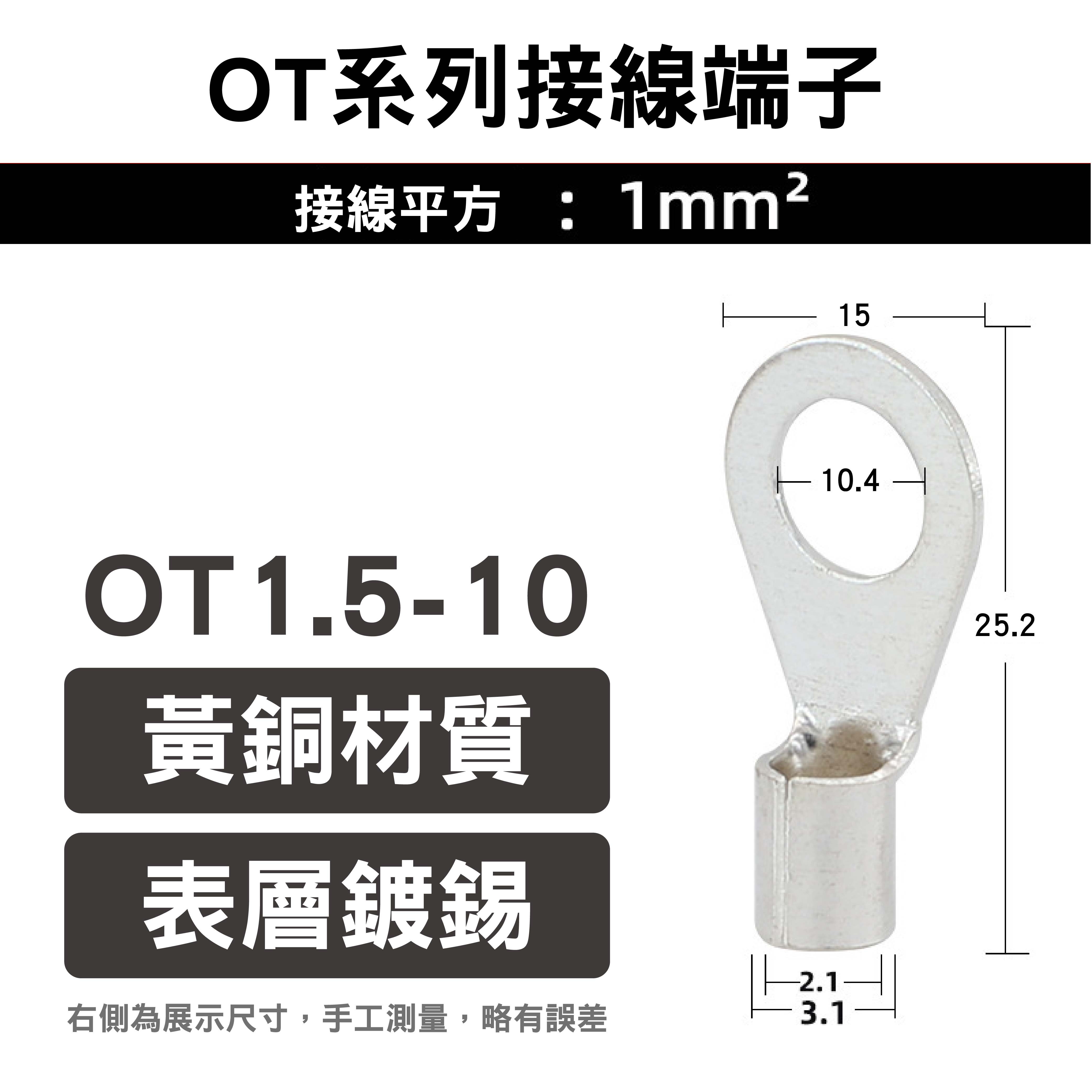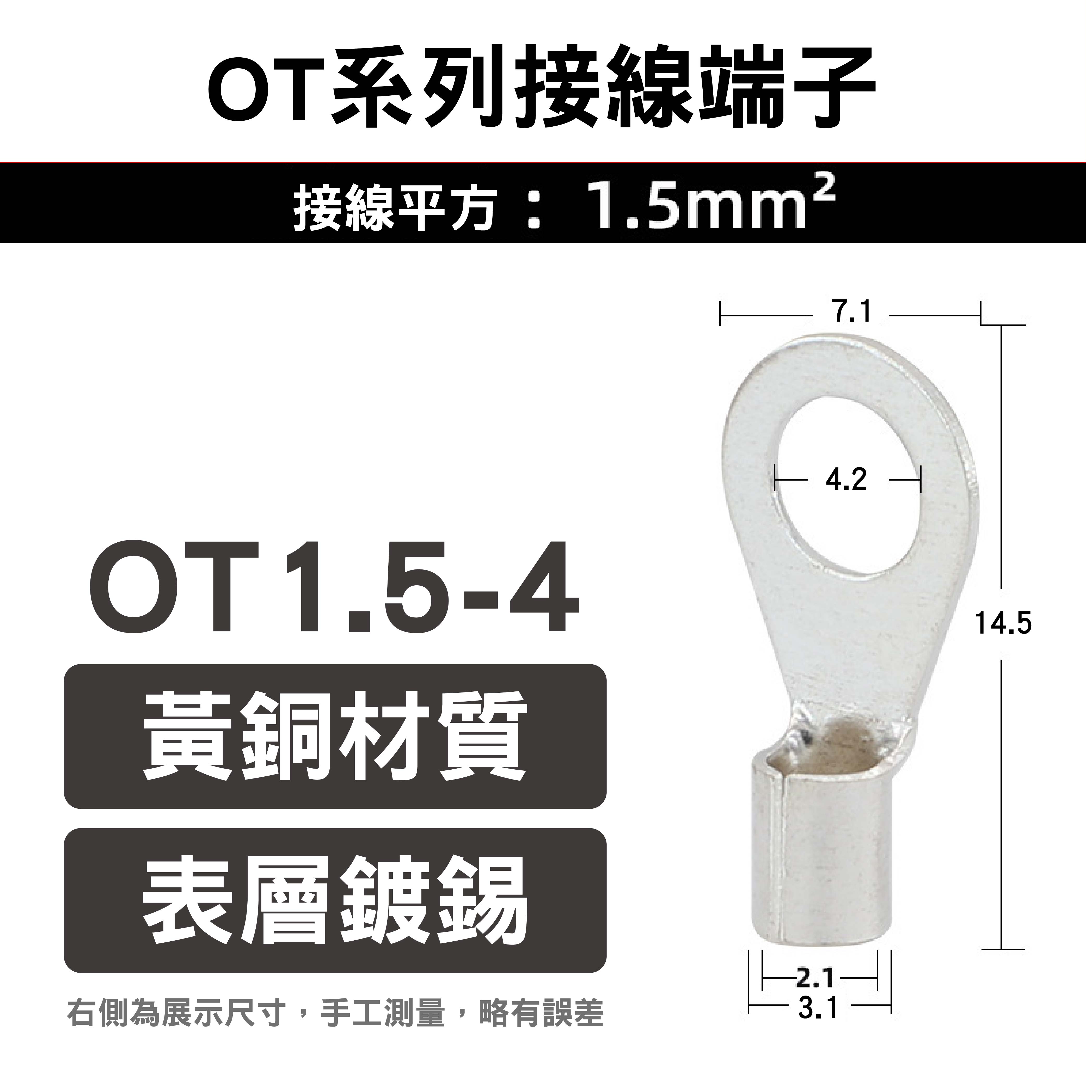 名稱說明:OT1.5-4=OT(系列)1.5(平方)-4(M4螺絲),1.5指端子可接1.5平方的線纜;4指安裝螺絲為M4規格。其他依此類推。